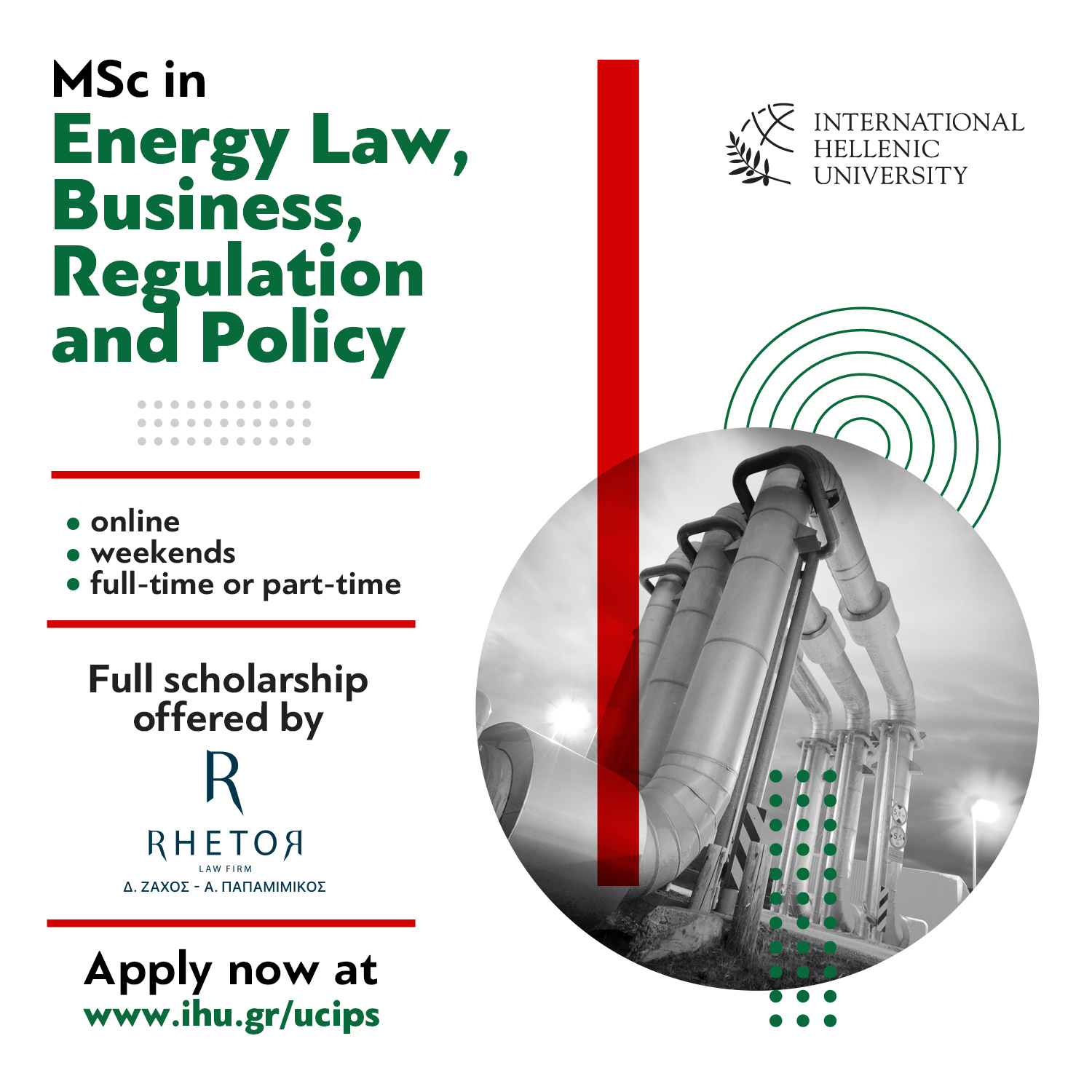 H δικηγορική εταιρεία RHETOR Law Firm, μέλος του ομίλου RHETOR προσφέρει μια πλήρη υποτροφια για το εξ αποστάσεως Μεταπτυχιακό Πρόγραμμα Σπουδών στην ΕΝΕΡΓΕΙΑ, με τίτλο: "MSc in Energy Law, Business, Regulation and Policy" (2022-2023)