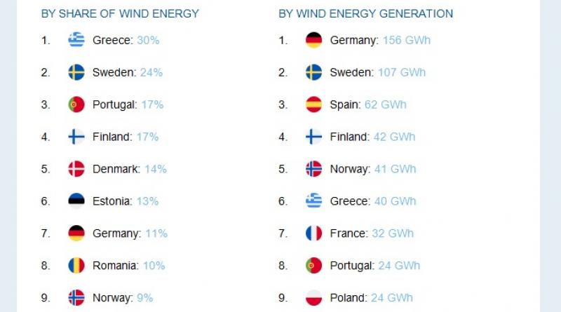 Πρωτιά η Ελλάδα χθες στην Ευρώπη στην αιολική ενέργεια.