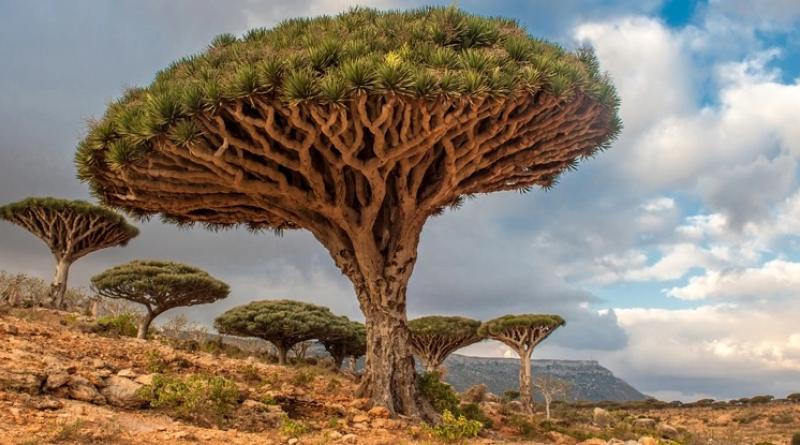 This includes the distinctive dragonsblood trees (Dracaena cinnabari), leftover from the ancient Oligocene woodlands, which are host to many other species that are entirely dependent on them, including many other plants and the gecko that pollinates it.