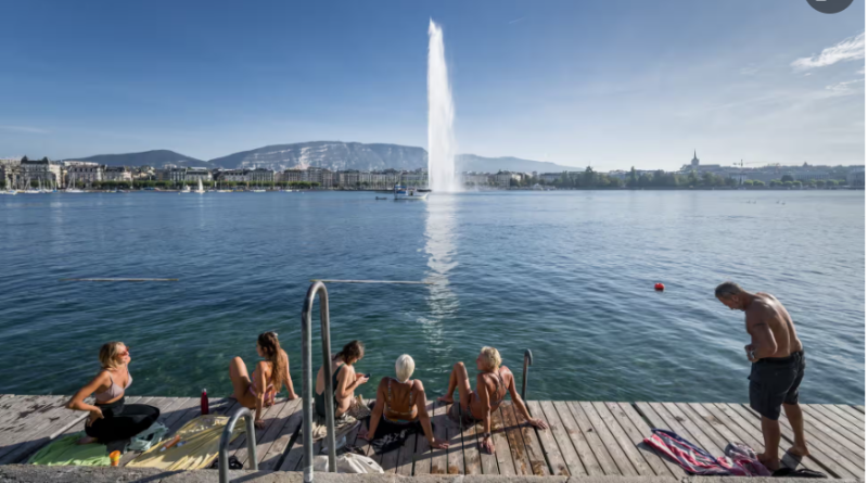 On Lake Geneva, it is not just swimmers benefiting from the inviting waters: people read, share beers with friends, children jump between rocks.