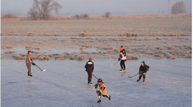 Cover photo: Young ice hockey players play on a frozen flooded field in Upware, Cambridgeshire. Photograph: Joe Giddens/PA