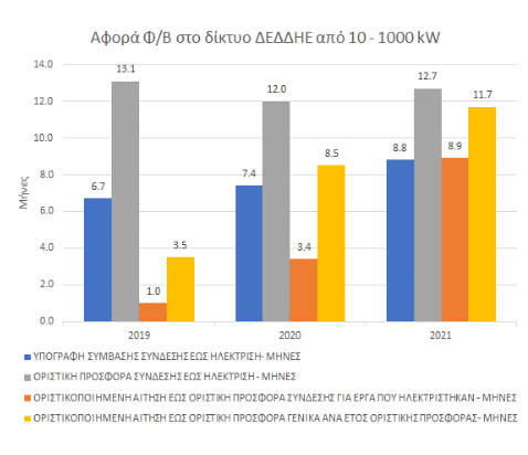 Αυτό που ισχύει μέχρι σήμερα, όπου η μεν σύμβαση σύνδεσης περιγράφει την εγκατεστημένη ισχύ, τον φορέα και την θέση του Φ/Β σταθμού, ενώ οι επενδυτές με τον φάκελο δήλωσης ετοιμότητας / αίτησης διασύνδεσης επικαιροποιούν στο διαχειριστή όλα τα στοιχεία του εξοπλισμού που χρησιμοποίησαν στην εγκατάσταση σε βάση πλέον “as constructed” εντός του ορίου της εγκατεστημένης ισχύος, είναι το απολύτως βέλτιστο. Οποιαδήποτε μεταβολή στο υφιστάμενο καθεστώς ως προς τον επενδυτή θα επιφέρει περιττή πολυπλοκότητα, εμπόδια και γραφειοκρατία, αφού κανείς δεν μπορεί στους 9 μήνες (μπλε μπάρες στο κάτωθι διάγραμμα σύμφωνα με μελέτη ΣΠΕΦ από τα επίσημα πρωτογενή στοιχεία ΔΕΔΔΗΕ) που κατά μέσο όρο μεσολαβούν από την υπογραφή της σύμβασης σύνδεσης έως την ηλέκτριση μιας εξαιρούμενης Φ/Β μονάδας, να εγγυηθεί πως θα βρει και θα χρησιμοποιήσει ακριβώς τον εξοπλισμό (μάρκα, τύπος, χαρακτηριστικά κλπ πανέλων/inverter/μετασχηματιστή/ηλεκτρονόμου), που δήλωσε κατά την υπογραφή της σύμβασης σύνδεσης.