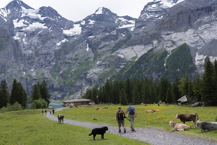 Experts approach Oeschinen See, which sees up to 4,000 tourists per day. Photograph: Thomas Cristofoletti/Ruom