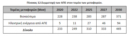 Αγνωστο γιατί, έχει μειωθεί σημαντικά η ηλεκτρική ενέργεια από ΑΠΕ στις μεταφορές. Ετσι, το 2020 η ηλεκτρική ενέργεια από ΑΠΕ στον τομέα των μεταφορών θα διαμορφωθεί σε 5 ktoe (έναντι 18 ktoe του αρχικού κειμένου), το 2022 σε 11 ktoe (28 ktoe), το 2025 σε 27 ktoe (58 ktoe), το 2027 σε 46 ktoe (86 ktoe), ενώ το 2030 σε 94 ktoe (154 ktoe).