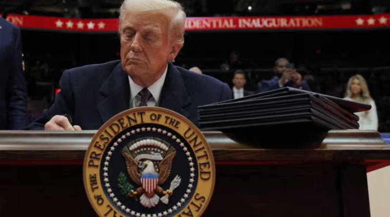 Cover photo: Donald Trump signs an executive order at the Capital One Arena in Washington DC on Monday. Photograph: Carlos Barría/Reuters
