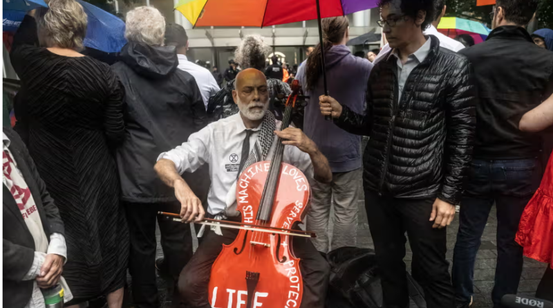 John Mark Rozendaal, a former music instructor at Princeton University, and Alec Connon, director of the climate nonprofit group Stop the Money Pipeline, were detained for 24 hours and charged with criminal contempt, which carries up to seven years in prison. Why? Rozendaal was playing a Bach solo on his cello while Connon sheltered him with an umbrella – which police claimed broke the conditions of a temporary restraining order that related to another bogus charge of assault (that was later dropped).