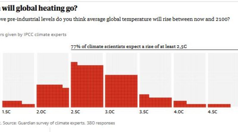 Hundreds of the world’s leading climate scientists expect global temperatures to rise to at least 2.5C (4.5F) above preindustrial levels this century, blasting past internationally agreed targets and causing catastrophic consequences for humanity and the planet, an exclusive Guardian survey has revealed.