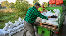 Workers at Wrocław zoo, close to the Oder River, build flood reinforcements on Wednesday. Photograph: Maciej Kulczyński/EPA
