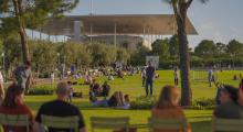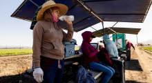 Farm workers take a break and drink water in the shade of a tent during a heat wave in Camarillo, California, on 3 July 2024. Photograph: Étienne Laurent/AFP via Getty Images