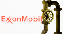 A 3D printed natural gas pipeline is placed in front of displayed ExxonMobil logo in this illustration taken February 8, 2022. REUTERS/Dado Ruvic/Illustration/File Photo