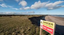 A coastal erosion warning sign at Montrose links in 2021. A report that year predicted 120 metres of coast would be lost over 40 years – but that is now accelerating. Photograph: Andy Thompson/Alamy…