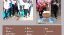 The donations can be inform of clothes shoes blankets pads diapers mattresses, school bags, books, pens and food.