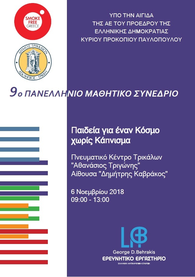 Στον Δήμο Τρικκαίων, που πρωτοστατεί στην εφαρμογή του νόμου για το κάπνισμα το «9ο Πανελλήνιο Μαθητικό Συνέδριο για την πρόληψη του καπνίσματος» είναι η ακλύτερη ευκαιρία για διάχυση της εκστρατείας. Μετά την άκρως επιτυχημένη ενημερωτική εκδήλωση του Ιανουαρίου του 2018 του Δήμου Τρικκαίων George D. Behrakis Ερευνητικό Εργαστήριο και το 5ο Γυμνάσιο Τρικάλων, η εκστρατεία εξαλλάσσεται και αναβαθμίζεται με τη διοργάνωση του συνεδρίου, υπό την αιγίδα του προέδρου της Δημοκρατίας, κ. Προκόπη Παυλόπουλου. Στις 6 Νοεμβρίου 2018 το συνέδριο θα πραγματοποιηθεί στο Πνευματικό Κέντρο Τρικάλων «Αθανάσιος Τριγώνης», στην Αίθουσα «Δημήτρης Καβράκος». Συνδιοργανωτές είναι, ο Δήμος Τρικκαίων, το George D. Behrakis Ερευνητικό Εργαστήριο, το Ινστιτούτο Δημόσιας Υγείας του Αμερικανικού Κολλεγίου Ελλάδος και η οργάνωση Smoke Free Greece. Ο τίτλος του είναι «Παιδεία για έναν Κόσμο χωρίς Κάπνισμα» και το πρόγραμμα είναι το ακόλουθο: