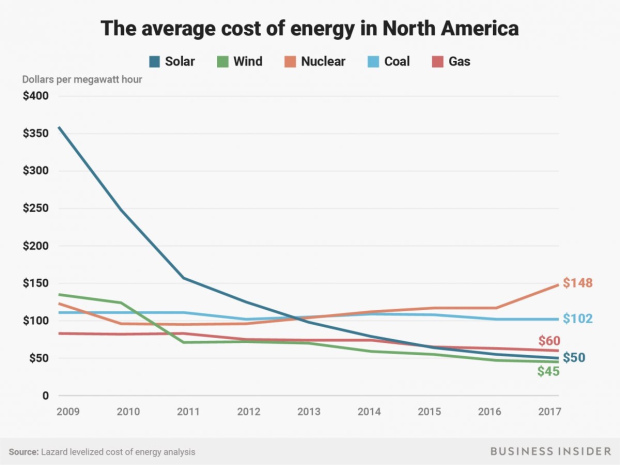 • Το κόστος της παραγωγής ηλεκτρισμού από την ηλιακή ενέργεια μειώνεται ραγδαία: σήμερα κοστίζει $50 για να παραχθεί μία μεγαβάτ-ώρα(MWh) ηλιακής ενέργειας.
