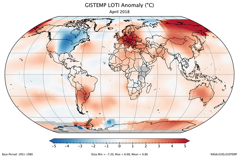 Τον περασμένο μήνα, ζήσαμε τον τρίτο θερμότερο Απρίλιο σε 138 χρόνια σύγχρονης καταγραφής στοιχείων, σύμφωνα με τη μηνιαία ανάλυση των παγκόσμιων θερμοκρασιών από τους επιστήμονες του Ινστιτούτου Διαστημικών Μελετών Goddard (GISS) της NASA ) στη Νέα Υόρκη.