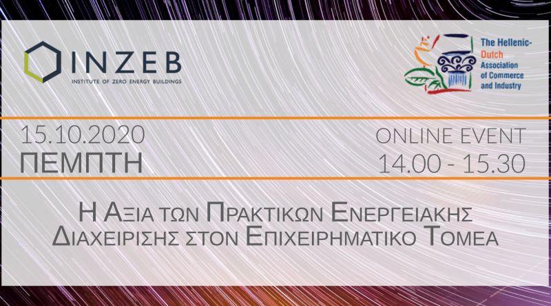 Το INZEB και ο Ελληνο-Ολλανδικός Σύνδεσμος (HeDA) σας προσκαλούν στη διαδικτυακή εκδήλωση/συζήτηση που διοργανώνουν, την Πέμπτη 15 Οκτωβρίου 2020 στις 14.00, ανοιχτή προς κάθε ενδιαφερόμενο, με θέμα "Η Αξία των Πρακτικών Ενεργειακής Διαχείρισης στον Επιχειρηματικό Τομέα". Για την εγγραφή σας, πατήστε εδώ.