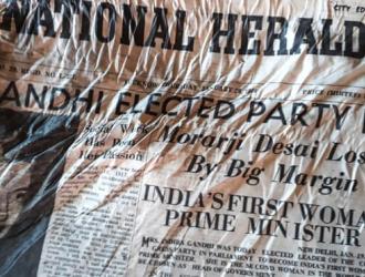 Receding French ice leaves behind newspapers proclaiming Indira Gandhi’s rise to become PM.