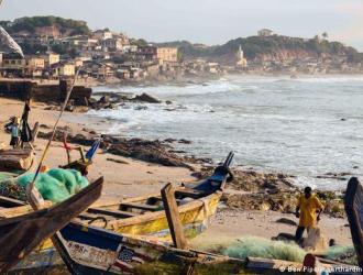 Scattered scraggy palm trees blow in the sea breeze, and stone ruins rise from the sand, the last remnants of a village besieged by the sea.