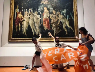 Environmental protesters have glued themselves to the glass protecting Sandro Botticelli’s Primavera which is on display at an art gallery in Florence.