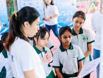 In its bid to contribute to Singapore's sustainability efforts, Keppel Electric is reaching out to schools to teach students about green alternatives and how they can help protect the environment Two young pupils stood in front of an exhibition board, eyes darti