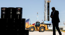 Donald Trump visits the Double Eagle Energy Oil Rig in Midland, Texas, on 29 July 2020. Photograph: Carlos Barría/Reuters