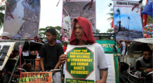People hold placards as they protest against environmental degradation which they blame on mining activity and climate change, near the Chamber of Mines of the Philippines Convention in Pasay city,…