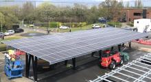 There's more than just cars and empty spaces in this car park. Huge arrays of angled solar panels sit atop jet black steel supports, soaking up the sun and shading the vehicles beneath.