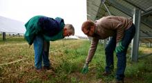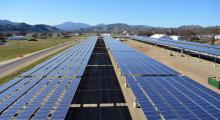 Over a dozen rows of blue solar panels stand in a grassy lot. This is the new solar field opened by Clif Bar. The panels will produce about a third of the energy needs for the company’s manufacturing…
