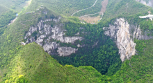 At the bottom of a sinkhole, ancient trees stretch nearly 130 feet high. Dense plants cover the ground, and a rare type of bamboo grows.