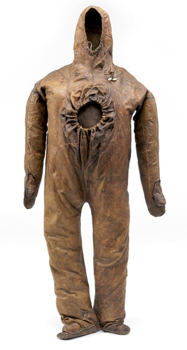 Awhaling suit towers up, as if some muscular occupant is still inside, looming over you. The suit, one of the highlights of this mind-expanding dive into Arctic cultures, is the Moby-Dick of clothes. Created by the Kalaallit people of south-west Greenland some time before 1834, it is like a modern survival suit: it could even be inflated by blowing into a tube. Except – it’s made of sealskin. Wearing this watertight armour, a hunter would leap from a small boat on to a whale’s back and spear it with a harpoon. But it’s not just a buoyancy aid. It is also a magical garment, thought to give its occupant the power of a seal, allowing them to stay afloat and endure the iciest water.