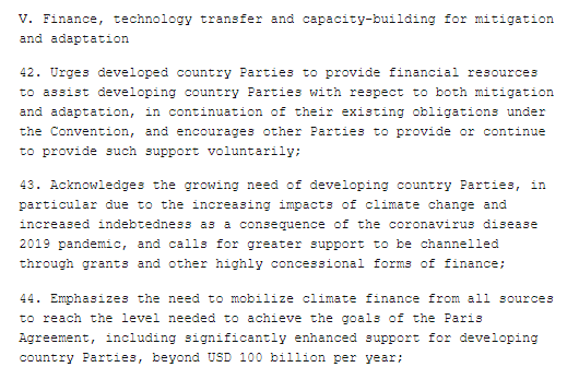 Mitigation is UN-speak for cutting emissions, so these are the key paragraphs. It is significant that this part of the text explicitly recognises the IPCC advice that emissions cuts of 45% are needed by 2030 – to have that stated so clearly, rather than alluded to vaguely, is a big win for those who want to focus on 1.5C rather than the upper limit of 2C in the Paris agreement.
