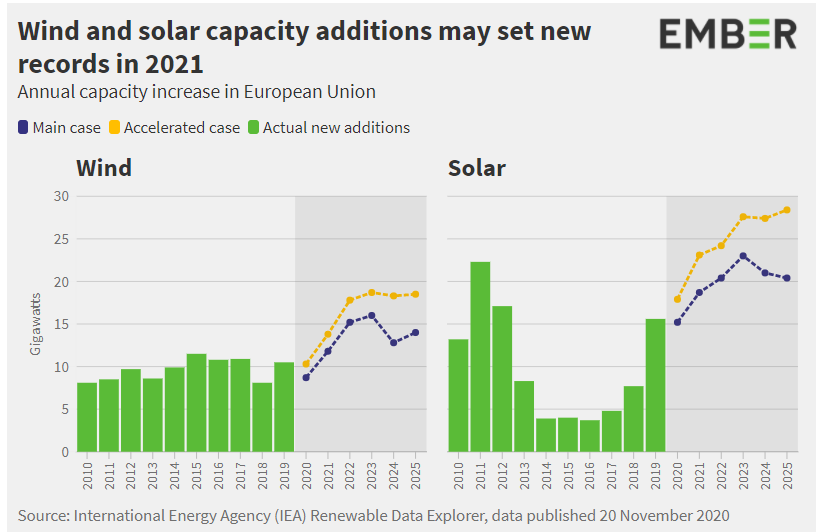 Wind and solar generation growth must nearly triple to reach Europe’s 2030 green deal targets. Wind and solar increased by 51 terawatt-hours in 2020, and whilst it wasn’t a record, it was well-above the 38 TWh/year average last decade. But annual additions will need to nearly triple to around 100 TWh/year to reach Europe’s 2030 target of 55% cuts to GHG emissions. That means well over 100 TWh added in 2030 itself, as growth picks up through the decade. Currently national energy and climate plans add up to only about 72 TWh/year, according to Ember’s Vision or Division? report, so countries still need to step up their 2030 national commitments.