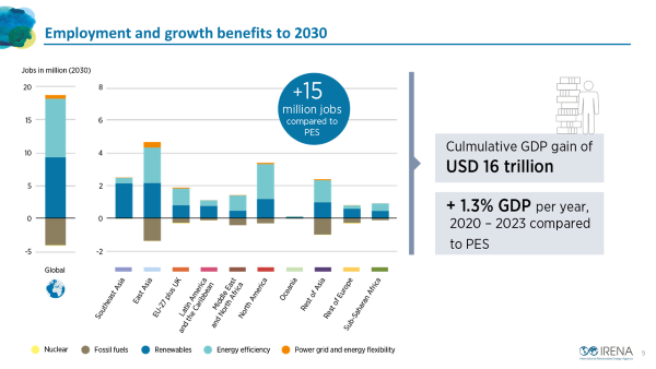 Post-COVID recovery: An agenda for resilience, development and equality outlines immediate stimulus action for the next three years (2021-2023) as well as measures for a mid-term 2030 recovery perspective over the next decade. It provides practical insights and recommendations for governments as they drive investment and policy actions for post-COVID-19 economies. The report shows that on an annual basis, scaling-up public and private energy spending to USD 4.5 trillion per year would boost the world economy by an additional 1.3%, creating 19 million additional energy transition-related jobs by 2030. Jobs in renewables alone could triple to 30 million by 2030. Every million dollars (USD) invested in renewables would create three times more jobs than in fossil fuels.