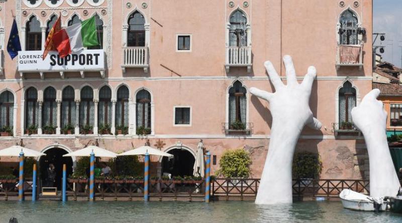 The installation, first unveiled by Quinn at the Venice Biennale in 2017 and commissioned by Halcyon Art International, shows two gigantic hands of a child emerging from the Grand Canal in Venice to protect and support the historical building of the Ca’ Sagredo Hotel.