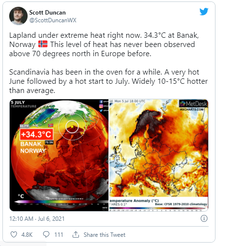 And Norway’s meteorological institute registered 34C (93.2F) in Saltdal, a county near the Polar Circle. That is the highest temperature measured in the country this year, and just 1.6C (2.9F) short of Norway’s all-time record.