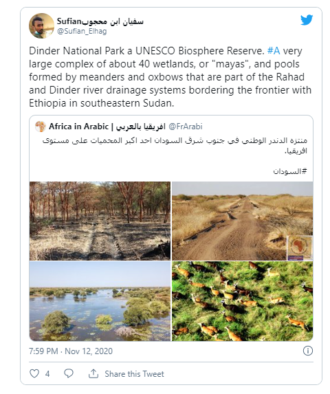 "It enjoys the richest wildlife in Sudan," said Albadri Alhassan, head of the park's development organisation. "But the growing human violations threaten to diminish the wilderness."