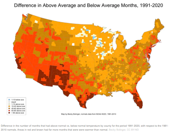 Across the continental U.S., the temperature rose by about 0.5 F on average from the 1981-2010 to 1991-2020 period. The new average is 1.2 F warmer than that of the 20th century. A couple of exceptions are cooling observed in the spring over the Northern Great Plains and cooling over the Southeast and Mid-Atlantic in November. December shows the greatest amount of warming.